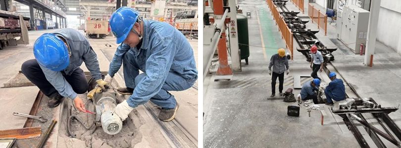 检修小组严格遵循既定标准执行每一项工作,力求高质量完成任务。创新采用"拆旧-吊装-校准"流水线作业形式,提升单台工效,针对5台新电机的螺栓孔距存在误差采用精准测量和开孔打磨工艺,针对12台次电机因轴与轴套锈蚀导致难以取出的问题采用“液压拉马+对角顶丝”等先进工艺,同时首创"彻底清洗+长效润滑"工艺,根治复发隐患。这场战役不仅是体力拼搏,也是管理智慧与文化软实力的双重胜利,更是《忠诚准则》第八条“全过程精细管理”的极致演绎。